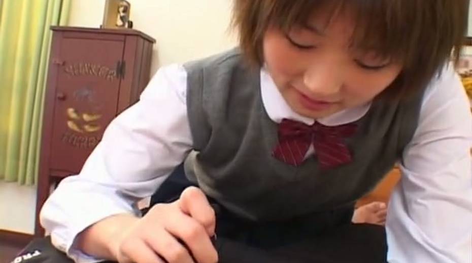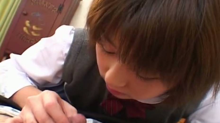 Short haired Japanese cutie in college uniform enjoys sucking dick